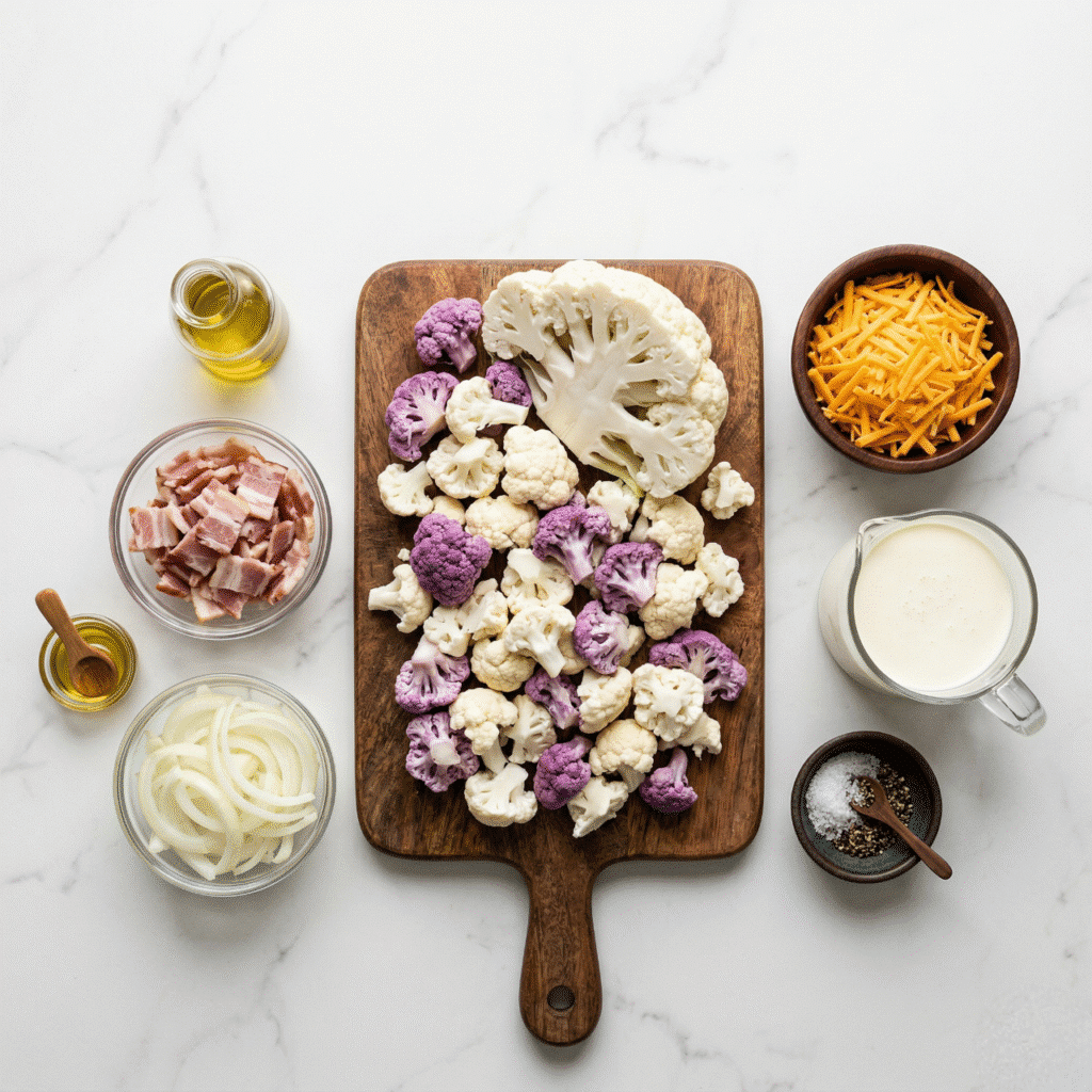 A deliciously creamy and savory bake featuring caramelized onions, crispy bacon, and cheesy cauliflower.