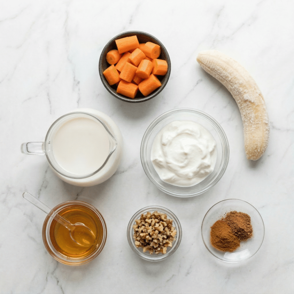 - In a blender, combine the chopped carrots, frozen banana, Greek yogurt, almond milk, cinnamon, nutmeg, and honey.