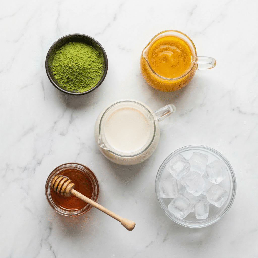 - Serving glasses: Clear glasses showcase the beautiful layers of your Iced Mango Matcha Latte. If you’re in a hurry, any sturdy cup will do!