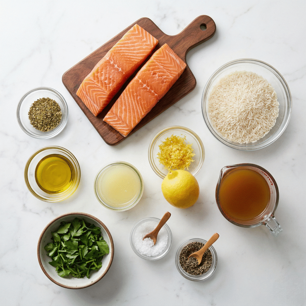 - Salt and pepper to taste – Essential for seasoning the salmon and rice.